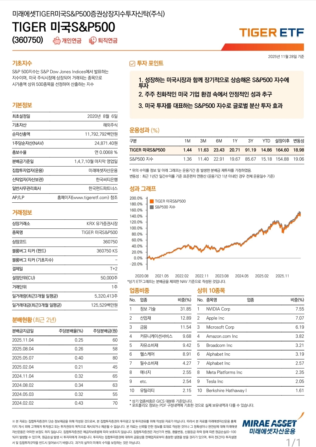 TIGER 미국S&P500 (360750) ETF에 대해 알기 쉽게 정리해 드립니다. 투자 초보자부터 연금 계좌 관리자까지 모두가 이해하기 쉬운 구조로 구성했습니다.🇺🇸 미국 주식 투자의 정석! TIGER 미국S&P500 ETF 완벽 분석미국 주식 시장을 대표하는 500개 우량 기업에 한 번에 투자하고 싶으신가요? 국내 상장 해외 ETF 중 가장 대표적인 'TIGER 미국S&P500'에 대한 핵심 정보를 쏙쏙 뽑아 정리해 드립니다.1. 어떤 상품인가요? (기본 정보)이 ETF는 미국의 S&P 500 지수를 그대로 추종하는 상품입니다. 애플, 마이크로소프트, 엔비디아 등 우리가 잘 아는 세계적인 기업 500곳에 분산 투자하는 효과가 있습니다. 종목코드: 360750 운용사: 미래에셋자산운..