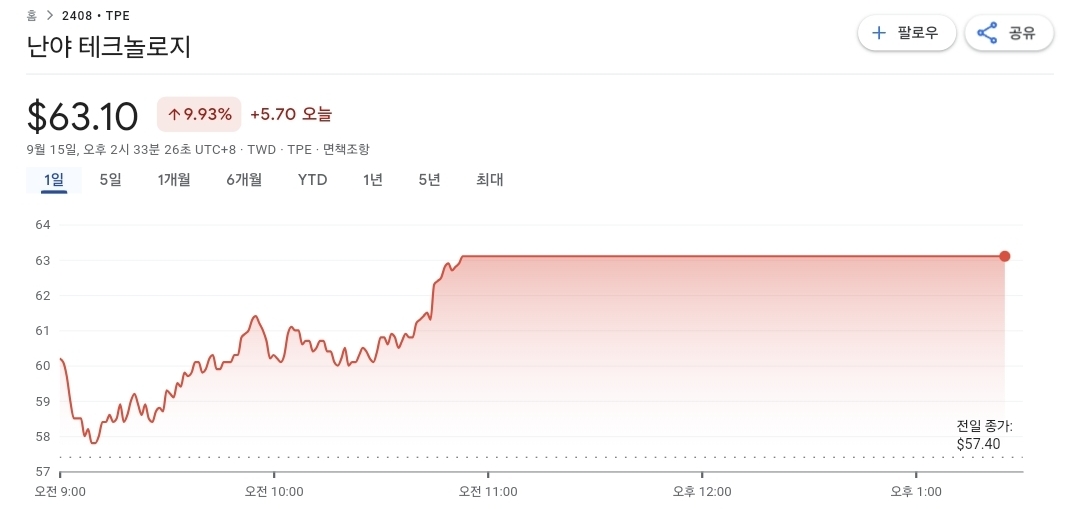 2025년 9월 15일 기준 난야 테크놀로지의 주가는 63.10 TWD로 1년 새 35% 이상 상승했으며, 최근 단기간에 주가가 급등해 시장의 주목도가 높아졌습니다. 그렇다면 난야의 상한가는 왜 발생했으며, 국내 대표 반도체주인 삼성전자와 SK하이닉스를 비롯한 한국 주식시장에는 어떤 영향을 미치게 될까요?