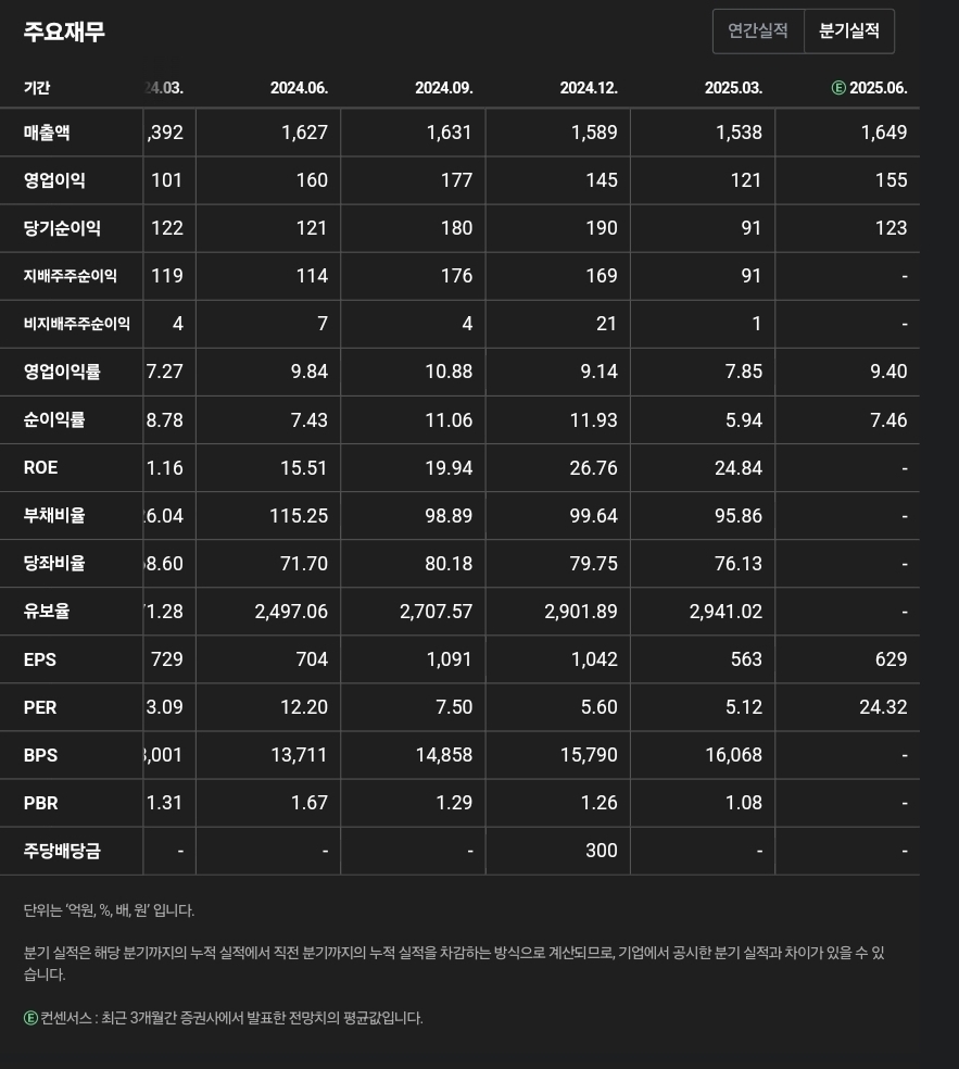 밸류에이션 측면에서는 PER 낮음+ROE 높음이라는 조합이 매력적입니다. PER만 업종 평균 수준으로 정상화돼도, 주가가 최소 50% 이상 오를 여력이 있다는 간단한 계산이 가능합니다. 예컨대, PER 8100% 이상 상승 가능성도 충분합니다.