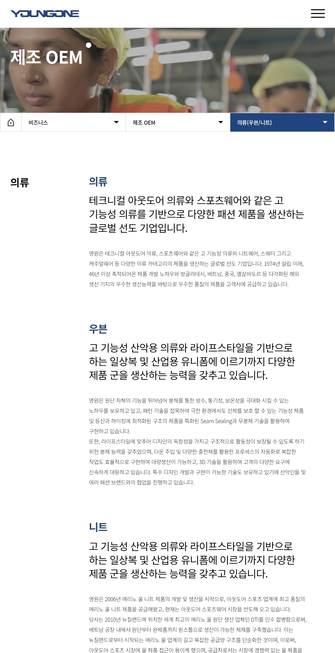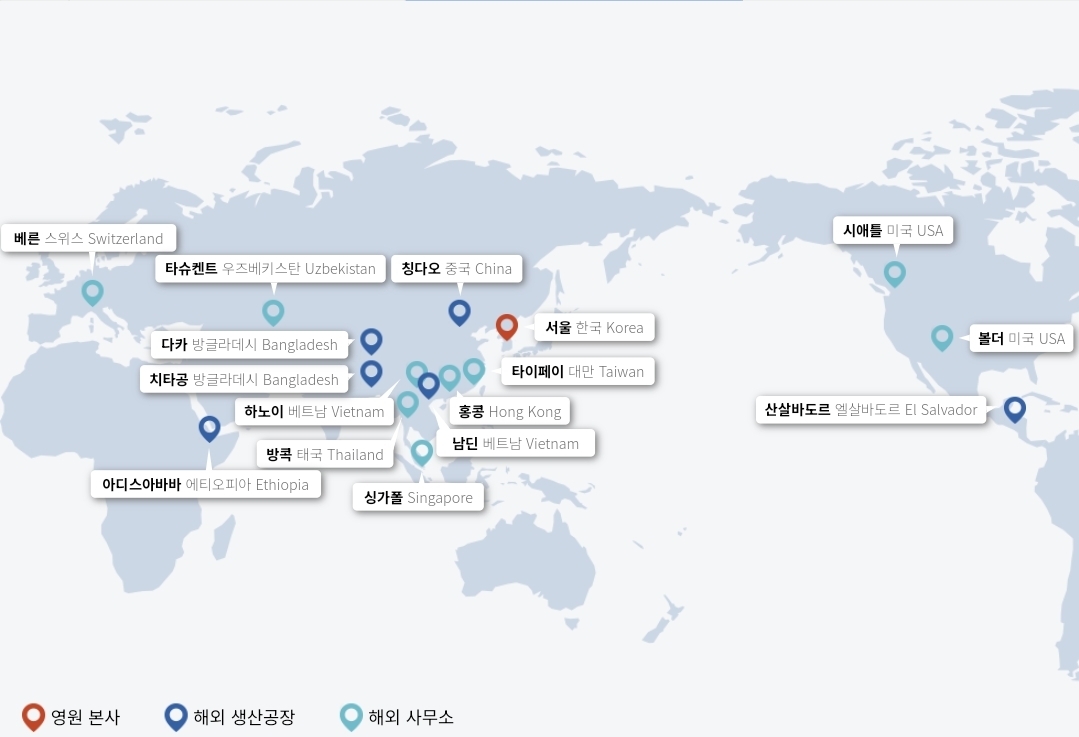제조 OEM(핵심): 글로벌 아웃도어·스포츠 의류·신발·백팩을 다국적 바이어에 생산·납품. 방글라데시/베트남의 대규모 공장과 원단(텍스타일) 자체 생산으로 리드타임 단축·원가경쟁력 확보.