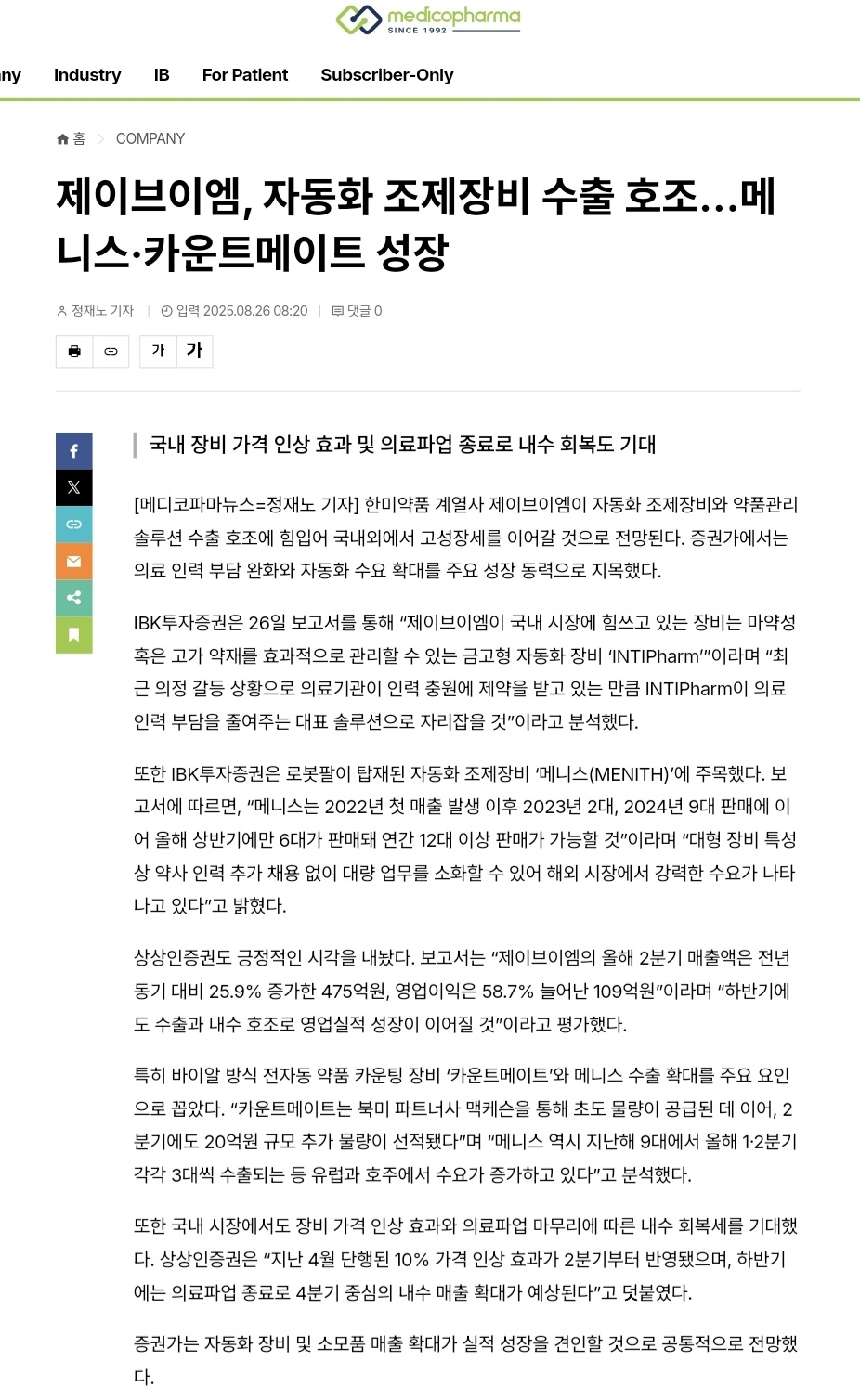 제이브이엠은 1977년 설립된 KOSDAQ 상장사로, 약국·병원 자동화 시스템 분야 국내 1위, 글로벌 시장 점유율 1위를 자랑하는 혁신 기업입니다. 핵심 제품인 자동조제 포장·분류 시스템(ATDPS)을 필두로 새로운 기술과 라인업을 꾸준히 선보이며, 60개국 이상에 장비를 공급하고 있습니다. 2025년 2분기에는 사상 최대 분기 매출(475억)과 영업이익(109억)을 달성, 북미·유럽 중심의 수출 확대와 내수 회복이 동시에 견인차가 되었습니다. 제이브이엠은 R&D 집중과 생산역량 강화로 글로벌 헬스케어 산업의 자동화 혁신을 선도하는 한편, 안정적인 성장과 수익성을 바탕으로 장기 투자 매력을 높이고 있습니다.