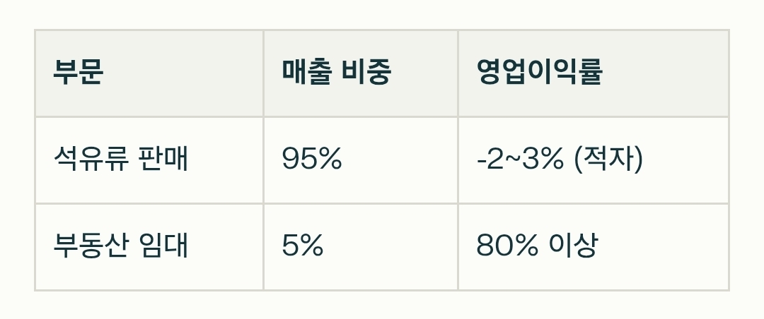 수익구조상 석유류 판매로는 손실이 발생하지만, 부동산 임대수익으로 전체 수익성을 유지하는 구조다.