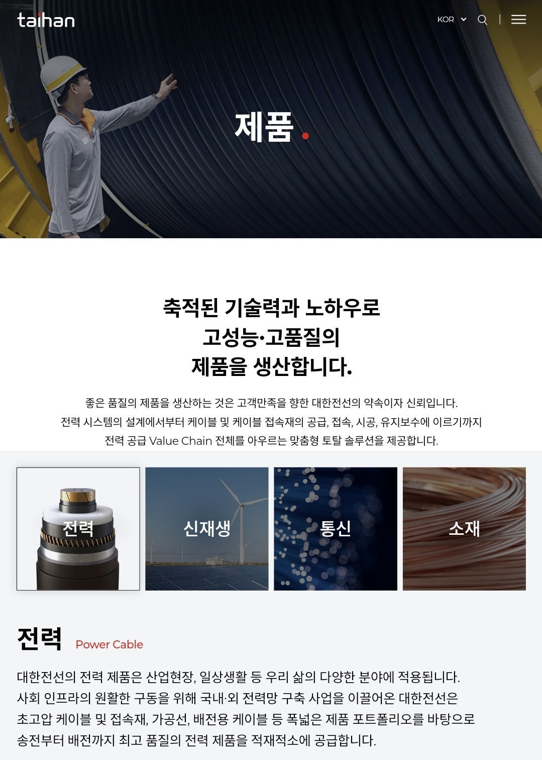 주력 제품: 나선 및 권선 부문이 전체 매출의 약 55%로 비중 가장 높음. 그 외 초고압·해저 케이블, 소재·기타 부문 포함 .