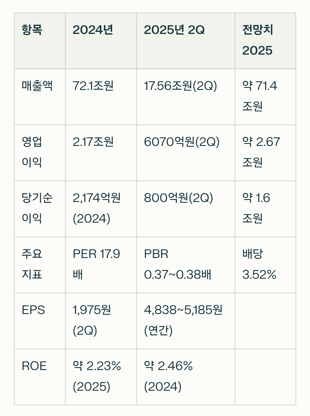 2025년 2분기 : 매출 17.56조, 영업이익 6070억, 당기순이익 800억, 영업이익률 3.5%